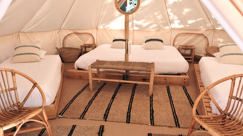Esta tenda, projetada para 4 pessoas, inclui 1 cama de casal e 2 camas individuais, roupa de cama, ventilador, iluminação, tomadas e terraço privado. Terá acesso às casas de banho partilhados do camping, com chuveiros, sanitários e lavatórios.