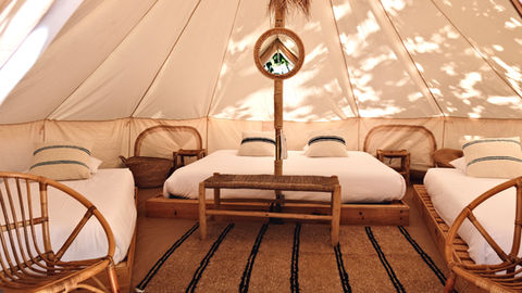 Tenda para 2 pessoas, inclui uma cama de casal, roupa de cama, ventilador, iluminação, tomadas e terraço privado. Terá acesso às casas de banho partilhados do camping, com chuveiros, sanitários e lavatórios.